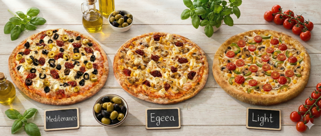 Variantele Mediteraneo, Egeea și Light sunt bogate în legume și brânzeturi ușoare, perfecte pentru cei care vor să includă pizza într-un stil de viață sănătos – fie că este vorba de o dietă sau de un stil alimentar mai strict.