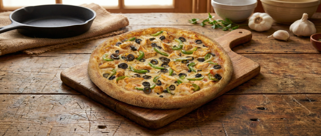 Pizza Rustic este ideală pentru persoanele care au intoleranță la lactoză – fără ceapa și cu minimum de mozzarella. Poți opta pentru extra pui și măsline în schimb!